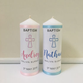 The most commonly ordered candle size for Baptism is the Standard (18cmx5cm). Taper candles (30cmx2cm) are a great idea for Godparents